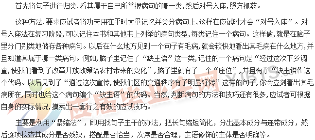 查找病句最好的方法是“語句緊縮法”也叫“主干枝葉梳理法”,即用找句子主干的方法,把句子縮短簡化,分出基本成分和連帶成分,然后逐項檢查。如果是一個復(fù)合句,除了一個單句一個單句地檢查外,還應(yīng)把單句配合起來,看看整個句子意思是否連貫,是否符合邏輯,關(guān)聯(lián)詞使用是否得當(dāng)?shù)鹊取?