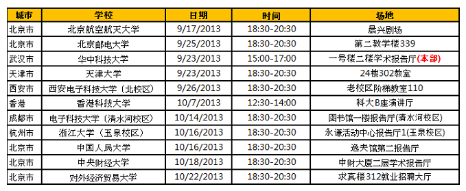 注意:2014年校園宣講會(huì)未必如此,因此請(qǐng)經(jīng)常關(guān)注應(yīng)屆畢業(yè)生網(wǎng)宣講會(huì)查詢系統(tǒng),以便得到最新最準(zhǔn)確的卓越亞馬遜校園宣講會(huì)信息。